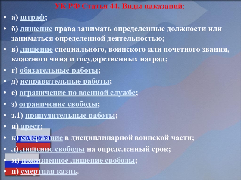 Слайд 13УК РФ Статья 44. Виды наказаний: