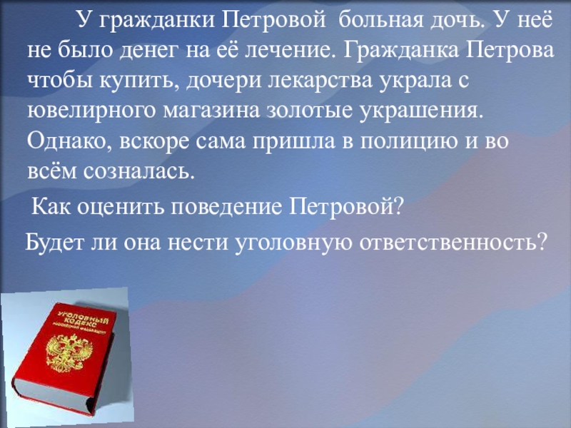 неё не было денег на её лечение. Гражданка Петрова чтобы купить, дочери лекарства украла с ювелирного магазина золотые украшения. Однако, вскоре сама пришла в полицию и во всём созналась.