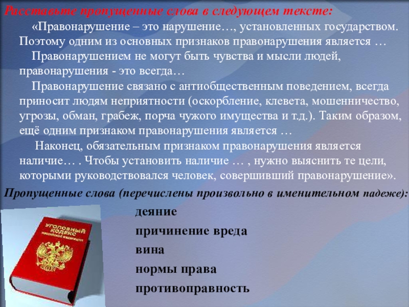 Правонарушение связано с антиобщественным поведением, всегда приносит людям неприятности (оскорбление, клевета, мошенничество, угрозы, обман, грабеж, порча чужого имущества и т.д.). Таким образом, ещё одним признаком правонарушения является …