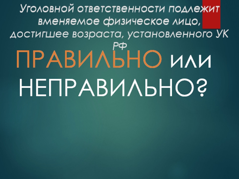 Слайд 29Уголовной ответственности подлежит вменяемое физическое лицо, достигшее возраста, установленного УК РФ