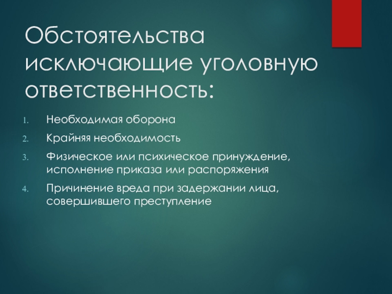 Слайд 12Обстоятельства исключающие уголовную ответственность: