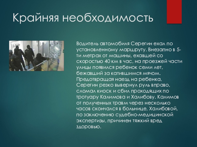 метрах от машины, ехавшей со скоростью 40 км в час, на проезжей части улицы появился ребенок семи лет, бежавший за катившимся мячом. Предотвращая наезд на ребенка, Серегин резко вывернул руль вправо, сломал киоск и сбил проходящих по тротуару Калимова и Халибову. Калимов от полученных травм через несколько часов скончался в больнице, Халибовой, по заключению судебно-медицинской экспертизы, причинен тяжкий вред здоровью.