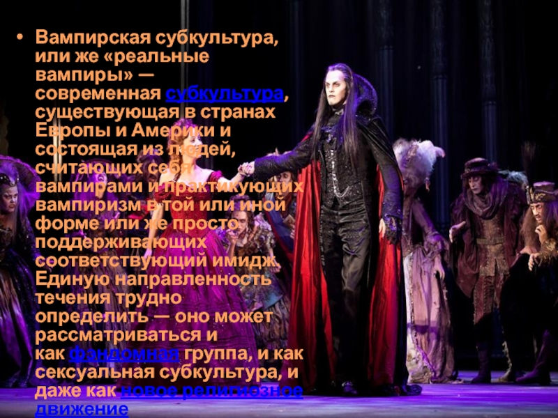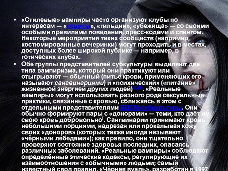 Слайд 2Вампирская субкультура, или же «реальные вампиры» — современная субкультура, существующая в странах Европы и