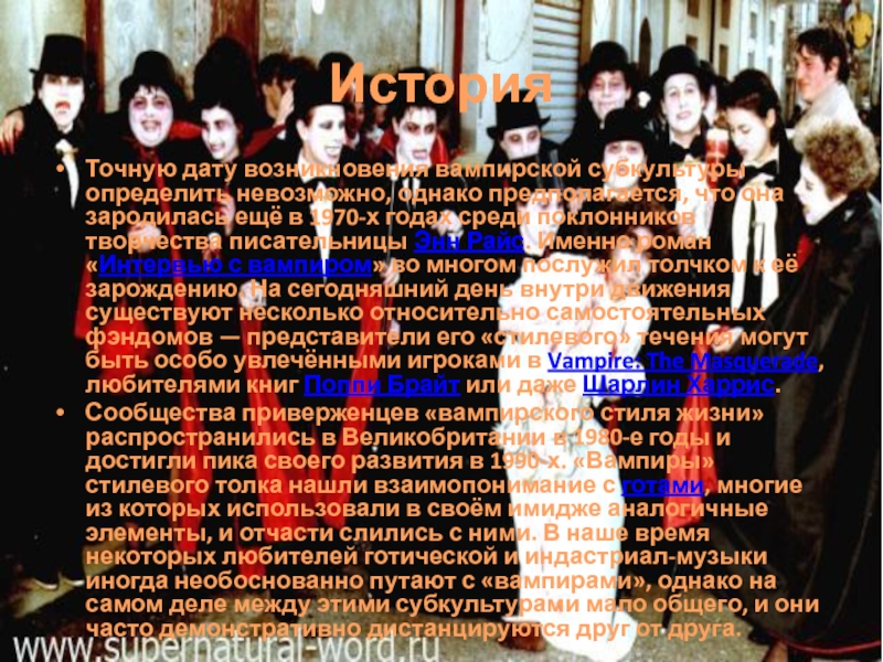 ИсторияТочную дату возникновения вампирской субкультуры определить невозможно, однако предполагается, что она зародилась ещё в 1970-х годах среди