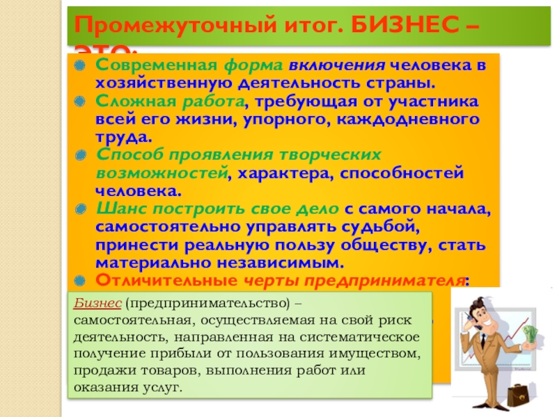 Бизнес (предпринимательство) – самостоятельная, осуществляемая на свой риск деятельность, направленная на систематическое получение прибыли от пользования имуществом, продажи товаров, выполнения работ или оказания услуг.