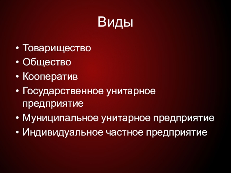 ВидыТовариществоОбщество КооперативГосударственное унитарное предприятиеМуниципальное унитарное предприятиеИндивидуальное частное предприятие