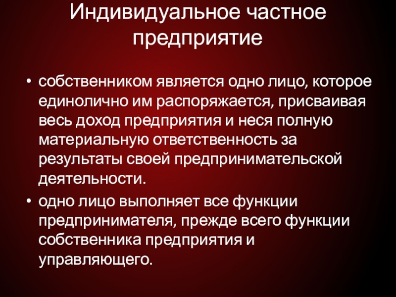 Индивидуальное частное предприятие  собственником является одно лицо, которое единолично им распоряжается, присваивая весь доход предприятия и