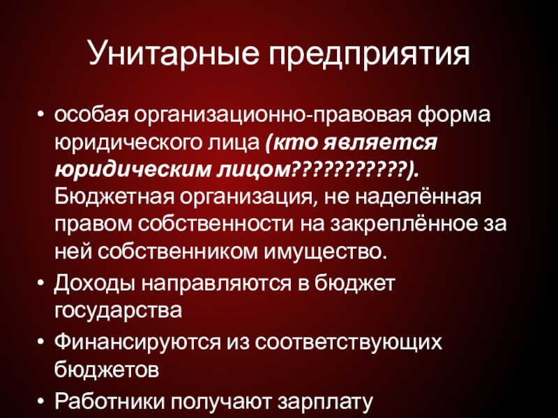 Унитарные предприятияособая организационно-правовая форма юридического лица (кто является юридическим лицом???????????). Бюджетная организация, не наделённая правом собственности на