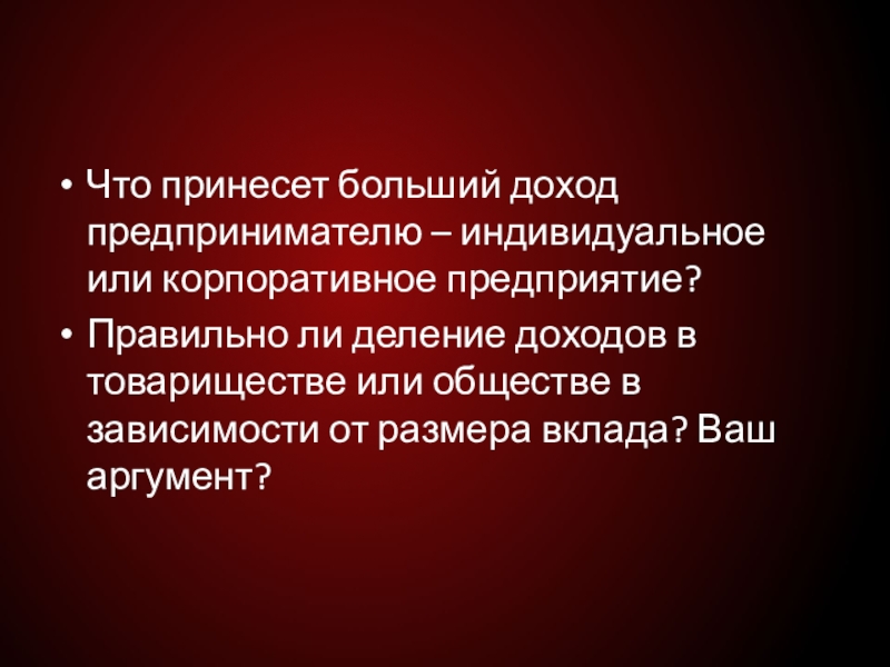Слайд 9Что принесет больший доход предпринимателю – индивидуальное или корпоративное предприятие?