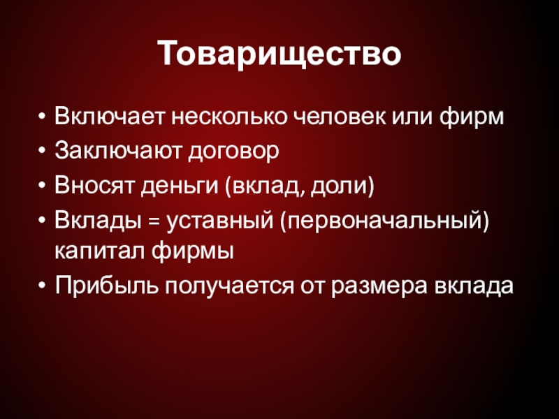 ТовариществоВключает несколько человек или фирмЗаключают договорВносят деньги (вклад, доли)Вклады = уставный (первоначальный) капитал фирмыПрибыль получается от размера