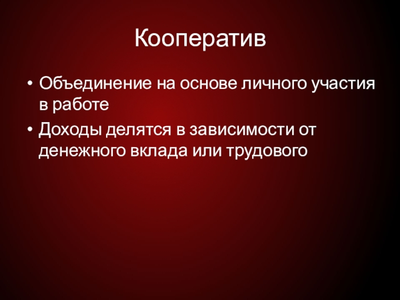 КооперативОбъединение на основе личного участия в работе Доходы делятся в зависимости от денежного вклада или трудового