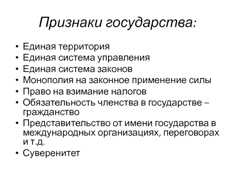 Признаки государства:Единая территория Единая система управленияЕдиная система законовМонополия на законное применение силыПраво на взимание налоговОбязательность членства в
