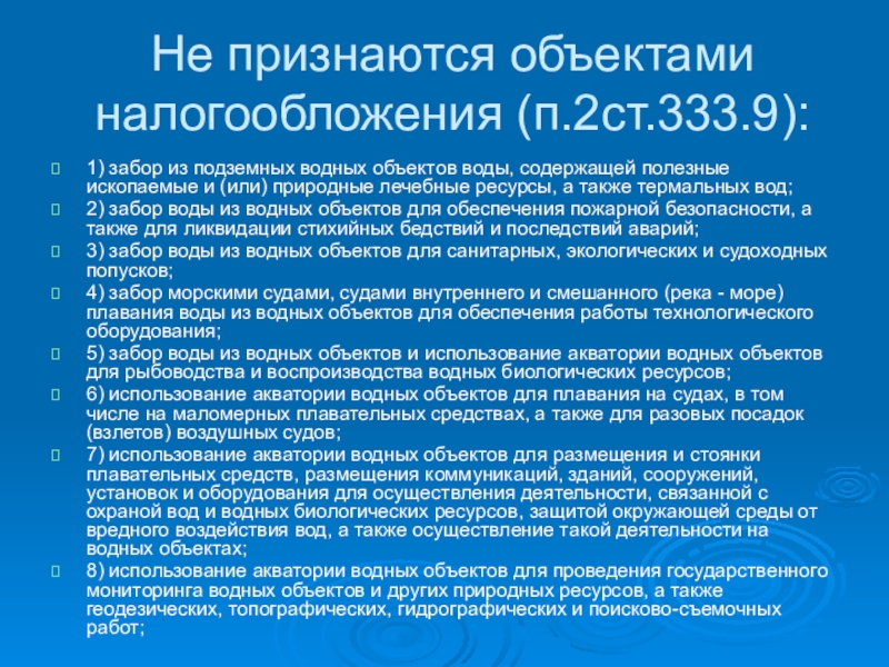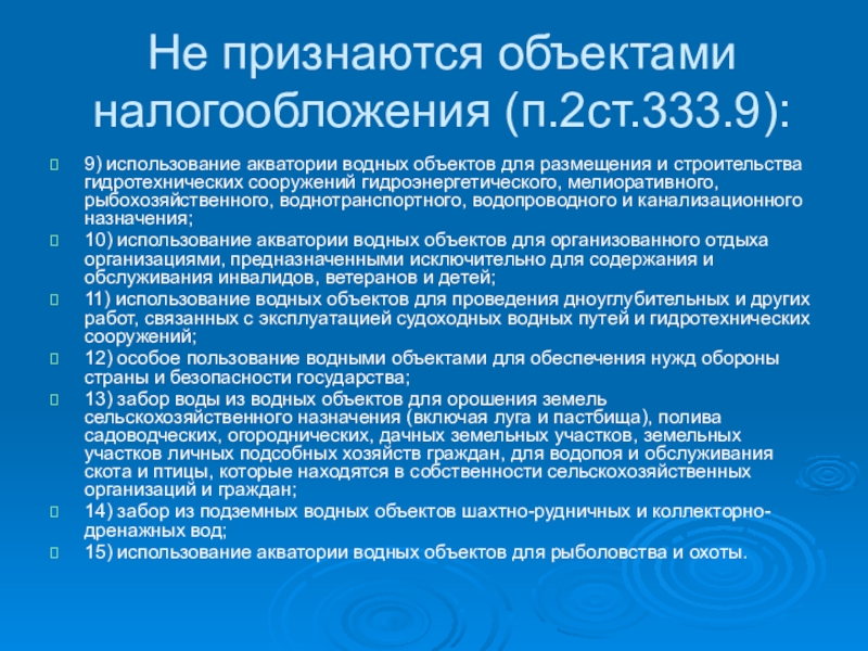водопользование в соответствии с законодательством РФ, признаваемое объектом налогообложения в соответствии со статьей 333.9 настоящего Кодекса.
