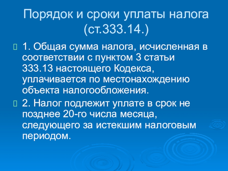 Слайд 12Порядок и сроки уплаты налога (ст.333.14.)