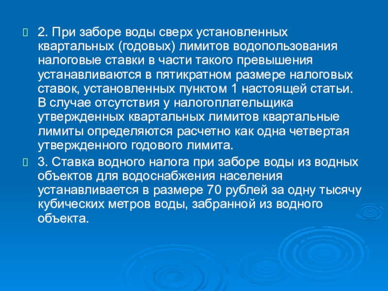 Слайд 102. При заборе воды сверх установленных квартальных (годовых) лимитов водопользования налоговые