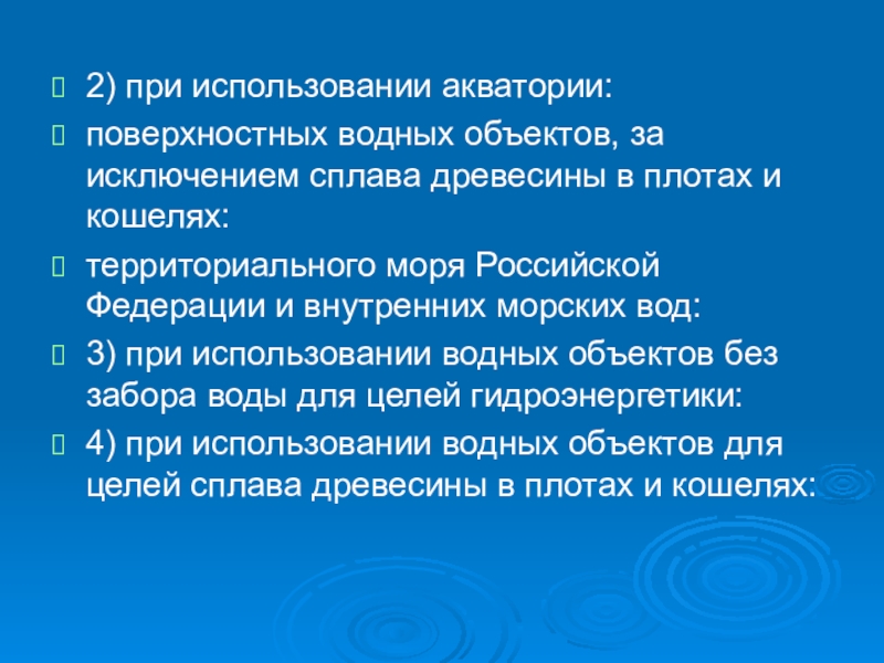 4) использование водных объектов для целей сплава древесины в плотах и кошелях.