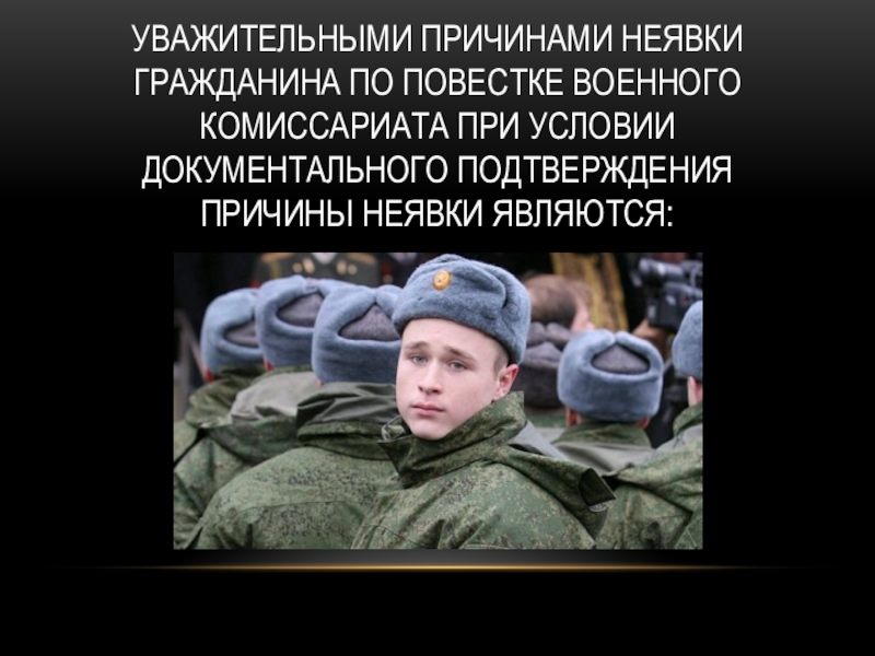 В случае неявки граждан в указанные в повестке военного комиссариата место и срок без уважительных причин, они привлекаются к ответственности в соответствии с законодательством Российской Федерации.
