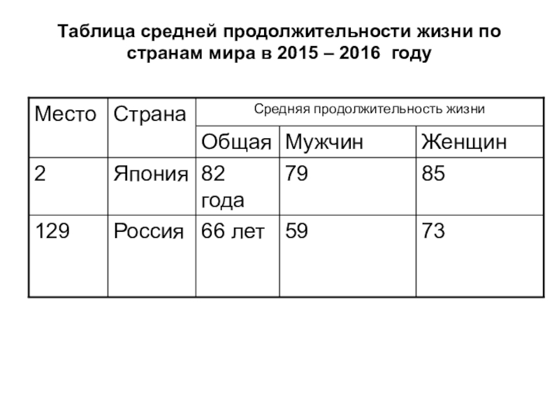 Слайд 10Таблица средней продолжительности жизни по странам мира в 2015 – 2016