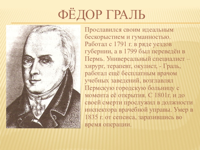 в ряде уездов губернии, а в 1799 был переведён в Пермь. Универсальный специалист – хирург, терапевт, окулист, - Граль, работал ещё бесплатным врачом учебных заведений, возглавлял Пермскую городскую больницу с момента её открытия. С 1801г. и до своей смерти прослужил в должности инспектора врачебной управы. Умер в 1835 г. от сепсиса, заразившись во время операции.