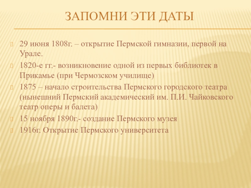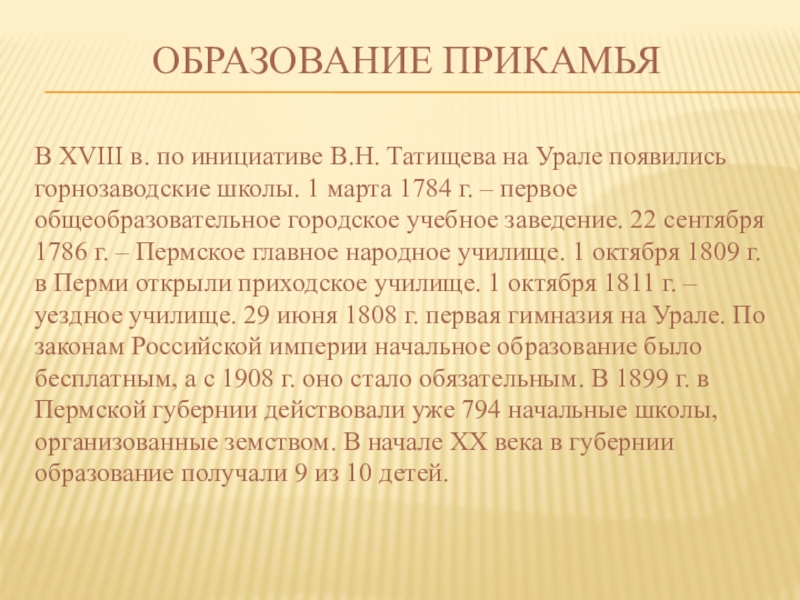 горнозаводские школы. 1 марта 1784 г. – первое общеобразовательное городское учебное заведение. 22 сентября 1786 г. – Пермское главное народное училище. 1 октября 1809 г. в Перми открыли приходское училище. 1 октября 1811 г. – уездное училище. 29 июня 1808 г. первая гимназия на Урале. По законам Российской империи начальное образование было бесплатным, а с 1908 г. оно стало обязательным. В 1899 г. в Пермской губернии действовали уже 794 начальные школы, организованные земством. В начале XX века в губернии образование получали 9 из 10 детей.