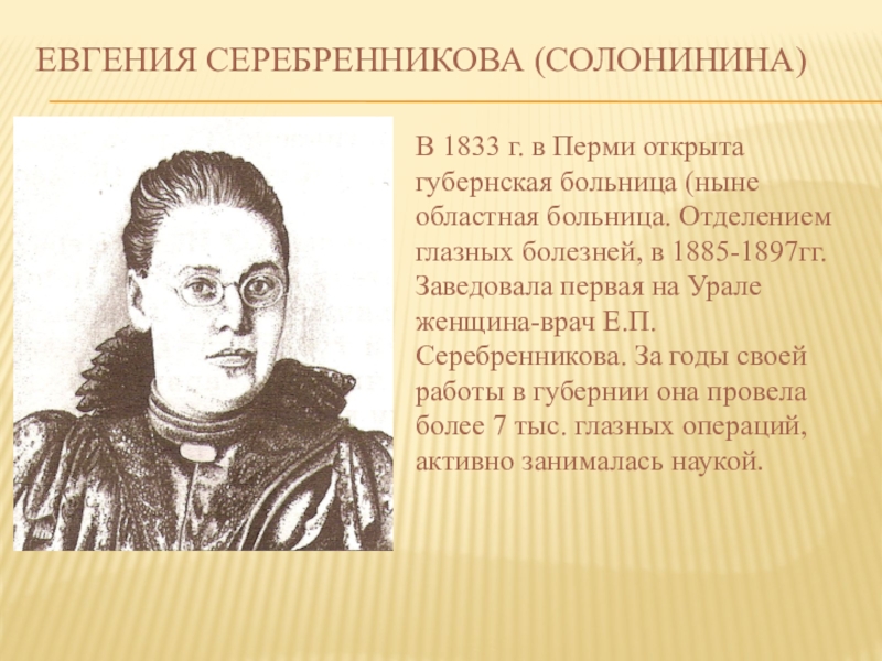 областная больница. Отделением глазных болезней, в 1885-1897гг. Заведовала первая на Урале женщина-врач Е.П. Серебренникова. За годы своей работы в губернии она провела более 7 тыс. глазных операций, активно занималась наукой.