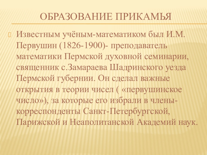 семинарии, священник с.Замараева Шадринского уезда Пермской губернии. Он сделал важные открытия в теории чисел ( «первушинское число»), за которые его избрали в члены-корреспонденты Санкт-Петербургской, Парижской и Неаполитанской Академий наук.