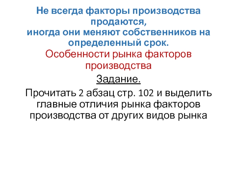 Прочитать 2 абзац стр. 102 и выделить главные отличия рынка факторов производства от других видов рынка