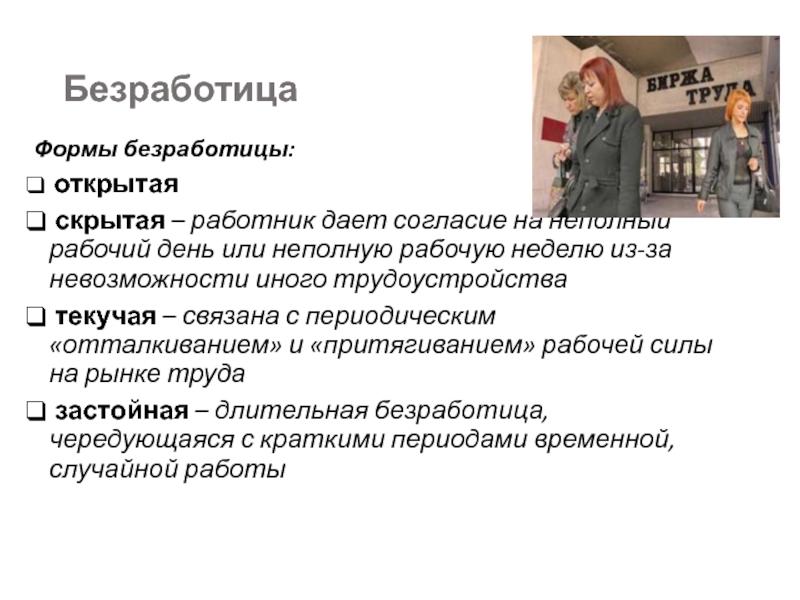 Исчезновение устаревших профессий (увольнение лифтеров, клепальщиков, машинисток), а также несовпадение спроса на труд и его предложения в различных областях (территориях), по разным профессиям и предприятиям.
