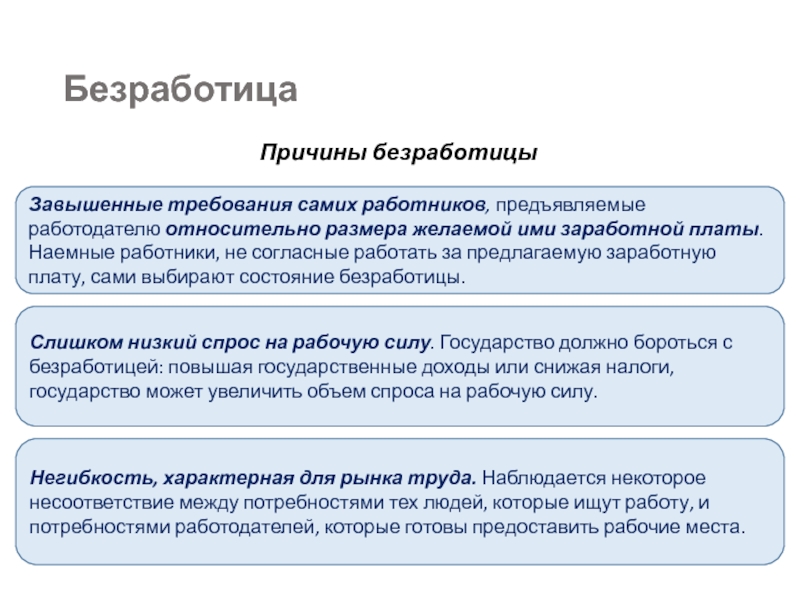 Слишком низкий спрос на рабочую силу. Государство должно бороться с безработицей: повышая государственные доходы или снижая налоги, государство может увеличить объем спроса на рабочую силу.
