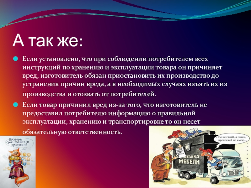 Если товар причинил вред из-за того, что изготовитель не предоставил потребителю информацию о правильной эксплуатации, хранению и транспортировке то он несет обязательную ответственность.
