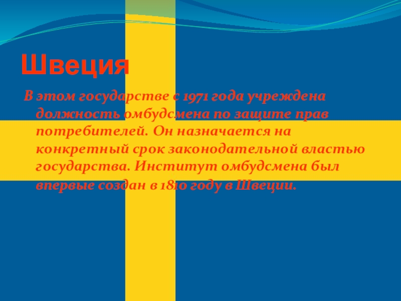 защите прав потребителей. Он назначается на конкретный срок законодательной властью государства. Институт омбудсмена был впервые создан в 1810 году в Швеции.