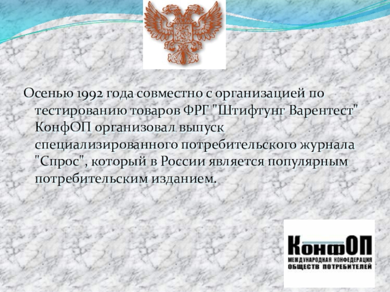Слайд 10Осенью 1992 года совместно с организацией по тестированию товаров ФРГ "Штифтунг