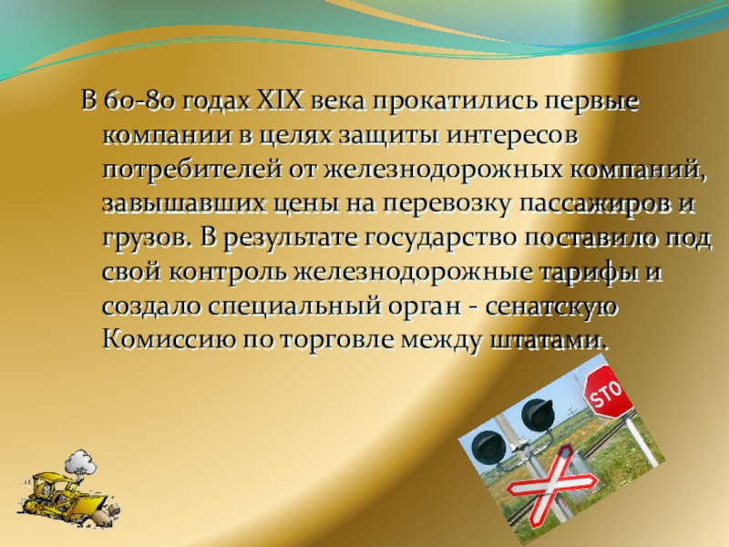 интересов потребителей от железнодорожных компаний, завышавших цены на перевозку пассажиров и грузов. В результате государство поставило под свой контроль железнодорожные тарифы и создало специальный орган - сенатскую Комиссию по торговле между штатами.