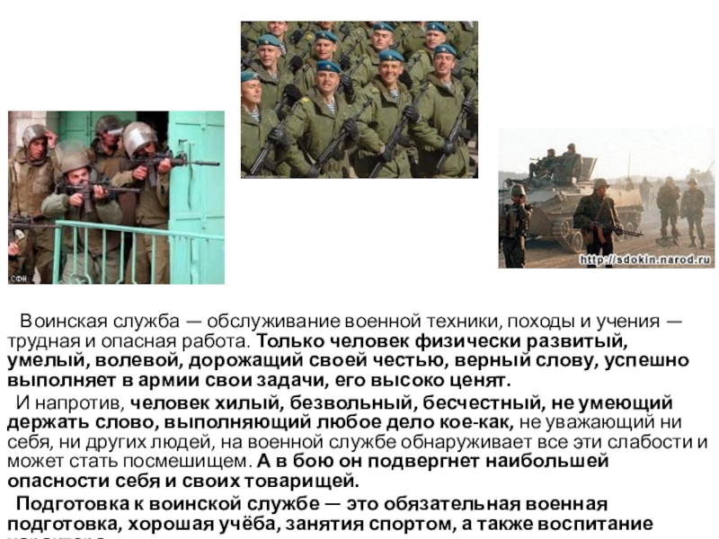 Подготовка к воинской службе — это обязательная военная подготовка, хорошая учёба, занятия спортом, а также воспитание характера.