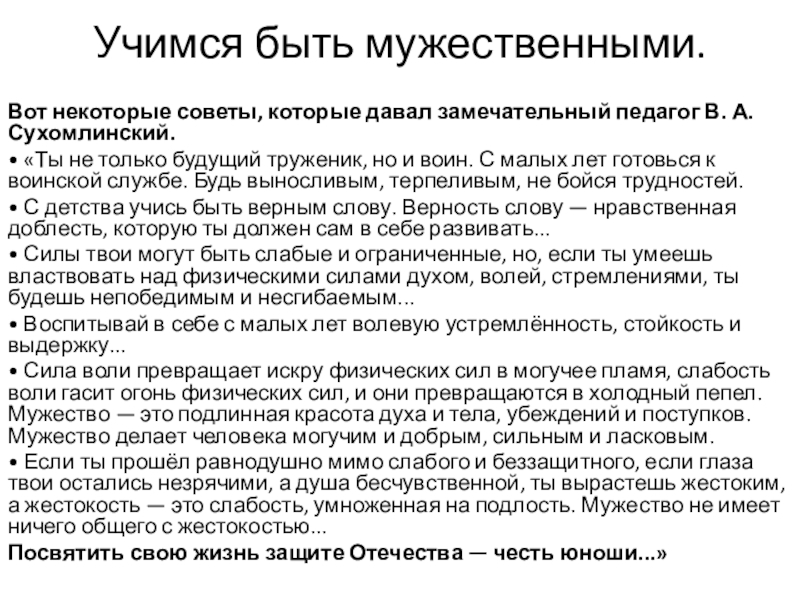 • «Ты не только будущий труженик, но и воин. С малых лет готовься к воинской службе. Будь выносливым, терпеливым, не бойся трудностей.