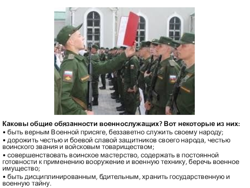 Слайд 16Каковы общие обязанности военнослужащих? Вот некоторые из них: