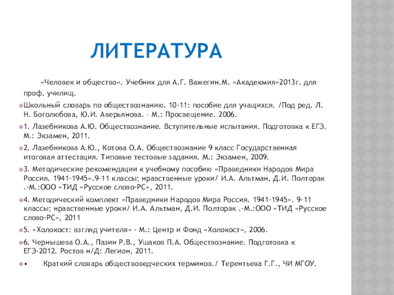 1. Лазебникова А.Ю. Обществознание. Вступительные испытания. Подготовка к ЕГЭ. М.: Экзамен, 2011.
