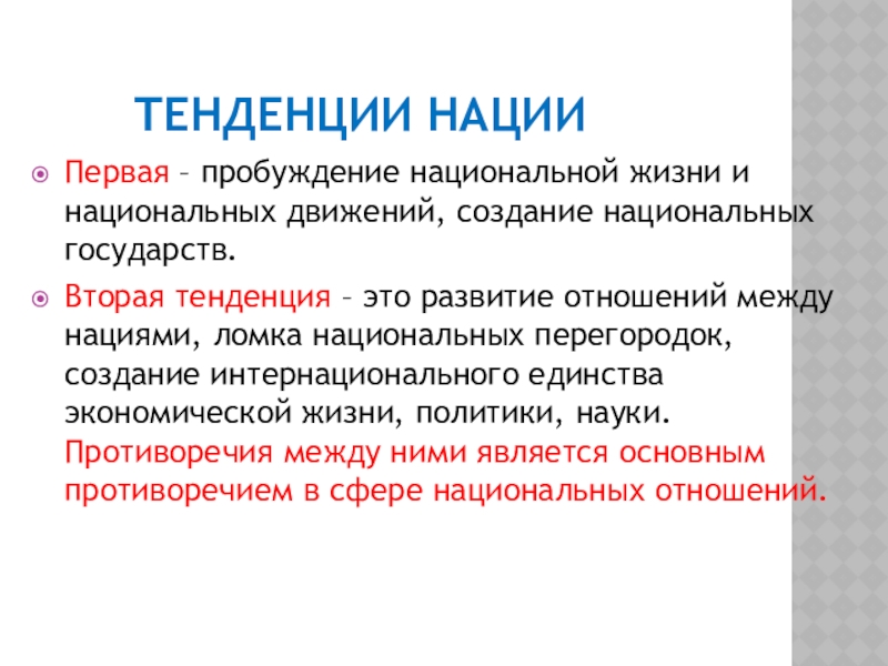 Вторая тенденция – это развитие отношений между нациями, ломка национальных перегородок, создание интернационального единства экономической жизни, политики, науки. Противоречия между ними является основным противоречием в сфере национальных отношений.