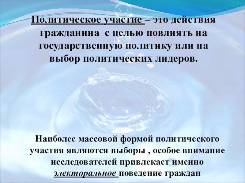 Наиболее массовой формой политического участия являются выборы , особое внимание исследователей привлекает именно электоральное поведение граждан