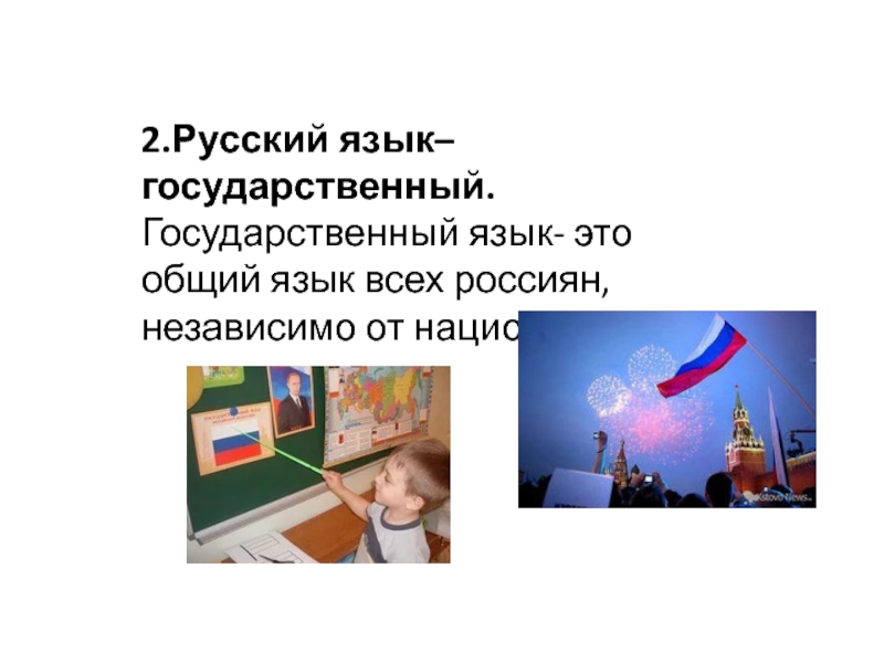 2.Русский язык–государственный. Государственный язык- это общий язык всех россиян, независимо от национальности.