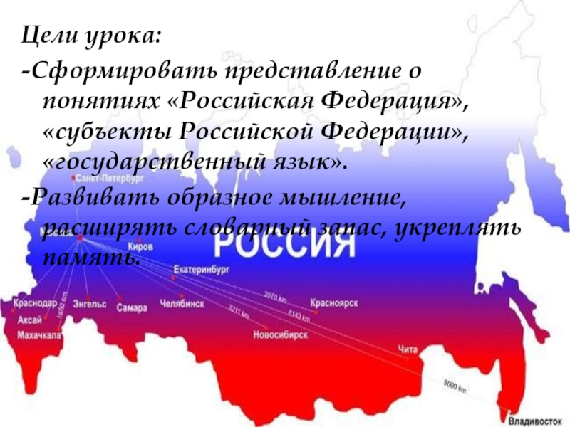 Цели урока:-Сформировать представление о понятиях «Российская Федерация», «субъекты Российской Федерации», «государственный язык».-Развивать образное мышление, расширять словарный запас,
