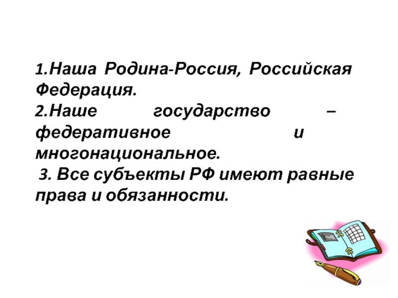 1.Наша Родина-Россия, Российская Федерация.2.Наше государство – федеративное и многонациональное. 3. Все субъекты РФ имеют равные права и