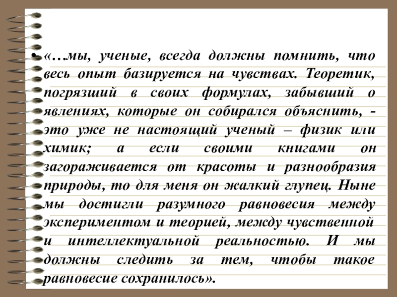 Теоретик, погрязший в своих формулах, забывший о явлениях, которые он собирался объяснить, - это уже не настоящий ученый – физик или химик; а если своими книгами он загораживается от красоты и разнообразия природы, то для меня он жалкий глупец. Ныне мы достигли разумного равновесия между экспериментом и теорией, между чувственной и интеллектуальной реальностью. И мы должны следить за тем, чтобы такое равновесие сохранилось».