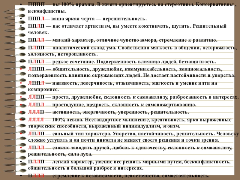 ЛПЛП — сильный тип характера. Упорство, настойчивость, решительность. Человеку сложно уступать и он почти никогда не меняет своего решения и точки зрения.