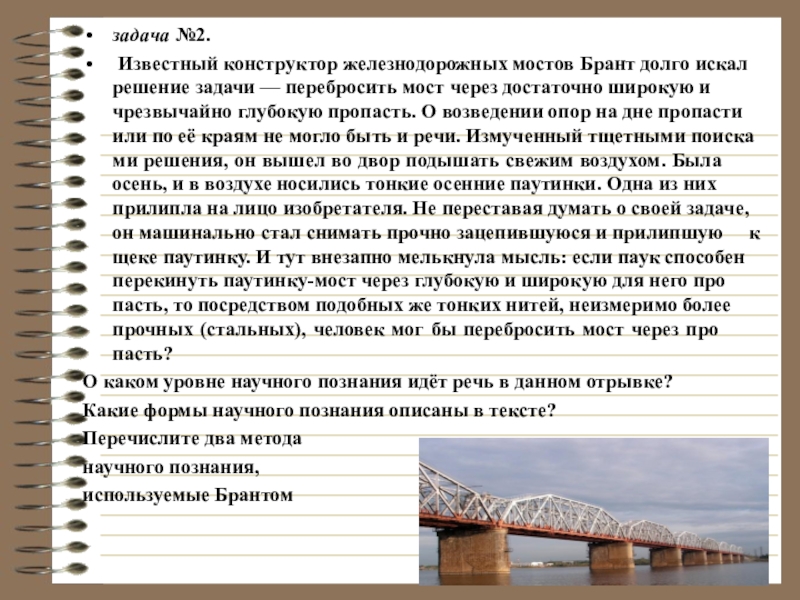 — перебросить мост через достаточно широкую и чрезвычайно глубокую пропасть. О возведении опор на дне пропасти или по её краям не могло быть и речи. Измученный тщетными поисками решения, он вышел во двор подышать свежим воздухом. Была осень, и в воздухе носились тонкие осенние паутинки. Одна из них прилипла на лицо изобретателя. Не переставая думать о своей задаче, он машинально стал снимать прочно зацепившуюся и прилипшую к щеке паутинку. И тут внезапно мелькнула мысль: если паук способен перекинуть паутинку-мост через глубокую и широкую для него пропасть, то посредством подобных же тонких нитей, неизмеримо более прочных (стальных), человек мог бы перебросить мост через пропасть?
