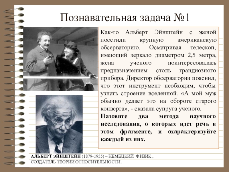 Осматривая телескоп, имеющий зеркало диаметром 2,5 метра, жена ученого поинтересовалась предназначением столь грандиозного прибора. Директор обсерватории пояснил, что этот инструмент необходим, чтобы узнать строение вселенной. «А мой муж обычно делает это на обороте старого конверта», - сказала супруга ученого.