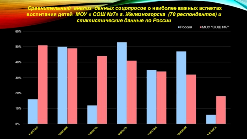 Слайд 14 Сравнительный анализ данных соцопросов о наиболее важных аспектах воспитания детей