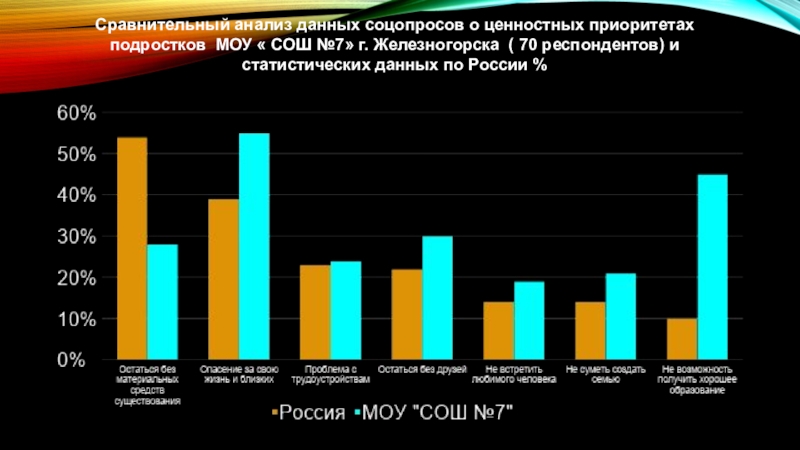 Слайд 12Сравнительный анализ данных соцопросов о ценностных приоритетах подростков МОУ « СОШ