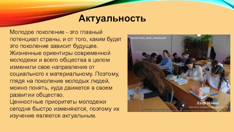 будет это поколение зависит будущее. Жизненные ориентиры современной молодежи и всего общества в целом изменили свое направление от социального к материальному. Поэтому, глядя на поколение молодых людей, можно понять, куда движется в своем развитии общество.