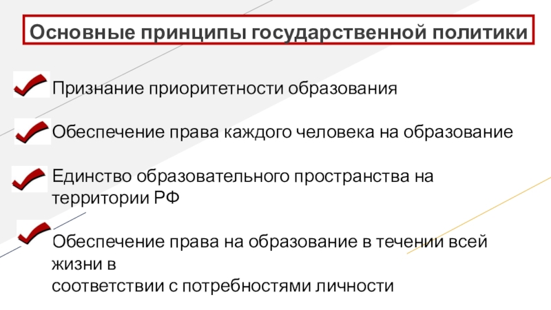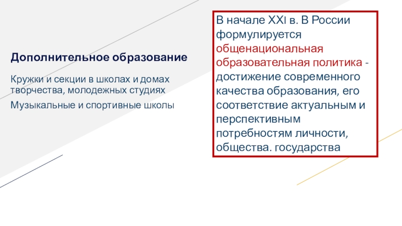В начале ХХI в. В России формулируется общенациональная образовательная политика - достижение современного качества образования, его соответствие актуальным и перспективным потребностям личности, общества. государства